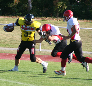Die Offense um Quarterback Kai Brand ließ sich diese Chance nicht nehmen und marschierte auf die Endzone der Sachsen zu. Schließlich war es einmal mehr Marco Brinkmann, der die Punkte markierte. Mit dem Extrapunkt von Ralf Posselt (#52) stand es nun 21:10.