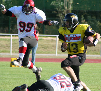 Die Crusaders steckten allerdings nicht auf. Unermüdlich kämpften sie weiter und warteten auf ihre Möglichkeiten. In dem spannenden Hin und Her der verbleibenden Zeit wähnten sich die Gastgeber wohl schon als Sieger, denn sie wurden nachlässiger und unkonzentrierter. Und dann war sie da, die Chance für Chemnitz wieder heranzukommen. Die Kreuzritter schafften das kaum Erwartete. Touchdown zuzüglich Extrapunkt 21:17.
