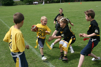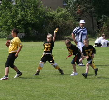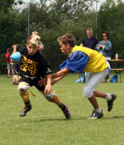 Aber nach dem Motto „Bange machen gilt nicht“ trafen die Flags gleich im ersten Spiel des Turniers auf die Virgin Guards. Wenn gleich beim Flagfootball der Körperkontakt zwischen den Spieler untersagt ist, so machte sich hier der Altersunterschied und damit der Größenunterschied bemerkbar.