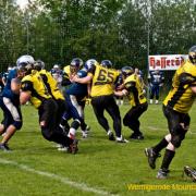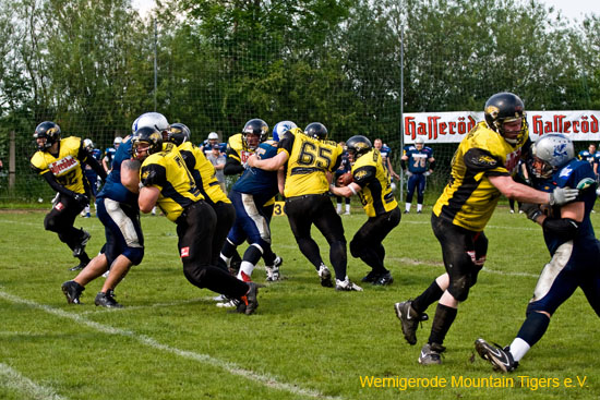 Gleich zu Beginn der Partie zeigten die Bergtiger, die erstmals mit Marvin Kellerhoff (QB #7) das Spiel eröffneten, dass die Saison ungeschlagen beendet werden soll. Eine bärenstarke Verteidigungsleistung, bei der anfänglich das Fehlen der Defense-Linemen Normen Hertwig und Moritz Schorpp zu bemerken war, rundete das Gesamtbild sehr positiv ab.