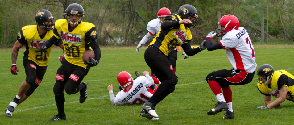 Die Gastgeber blieben unbeeindruckt und antworteten im direkten Gegenzug. Max Steuer (#80) fing einen Ball von QB Dominik Knispel (#19) und arbeitete sich in die Endzone der Kreuzritter. Mit dem anschließenden Kick durch Andreas Janko (#89) war schließlich der Ausgleich geschaffen.