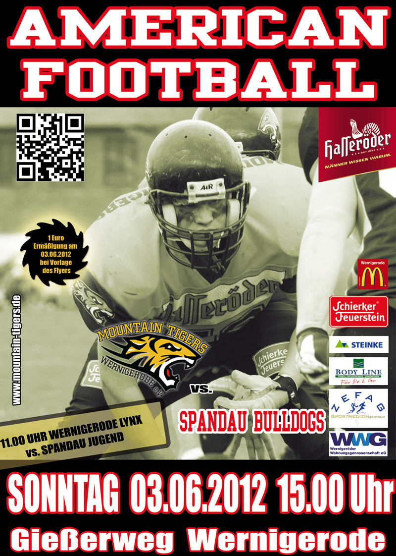 Am kommenden Sonntag ist wieder ein Doubleheader im Gießerweg. Dabei treffen die Wernigerode Mountain Tigers und die Wernigerode Lynx auf die Spandau Bulldogs.Ab 11:00 Uhr wird die Jugend der American Footballer mit dem Jugend-Team aus der Bundeshauptstadt die Kräfte messen und um die Liga-Krone kämpfen, denn beide Teams sind ungeschlagen.