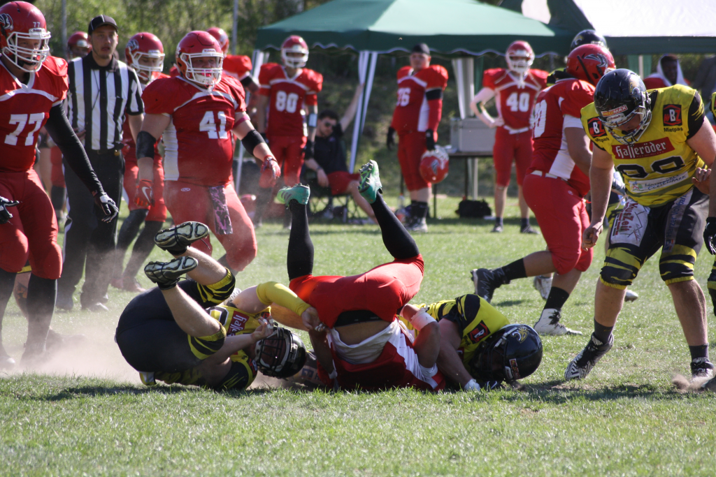 Und wieder dominierten die Defensereihen beider Mannschaften das Spiel. Die sonst so sicher stehende Offenseline der Tigers wurde mehrfach durchbrochen. Die Auswirkungen bekam der Quarterback der Tigers Dominik Knispel zu spüren. Er machte mit dem harten und staubigen Boden des Falkenfield so seine Erfahrungen.