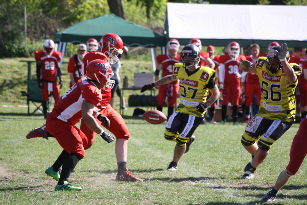 Ende des 2. Quarter waren die Tigers kurz vor der Endzone der Falken. Mit Pässen versuchten die Harzer nun die letzten Meter zu überbrücken, hatten aber keinen Erfolg. Das Gegenteil trat ein, ein nicht gefangener Ball sprang hoch in die Luft und ein Falke fing diesen, Interception und Wechsel des Angriffsrecht.
